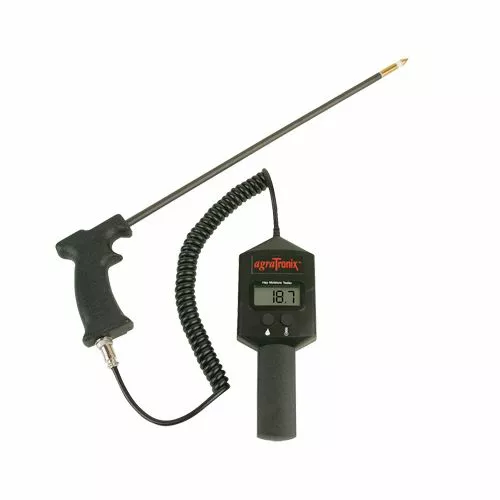AgraTronix DHT-1 Portable Hay Moisture Tester will give a direct readout for the percent of moisture and temperature (Fahrenheit and Celsius) of your hay. The backlite LCD display allows for night time use. This tester will be accurate through out the normal range of stored, baled hay.