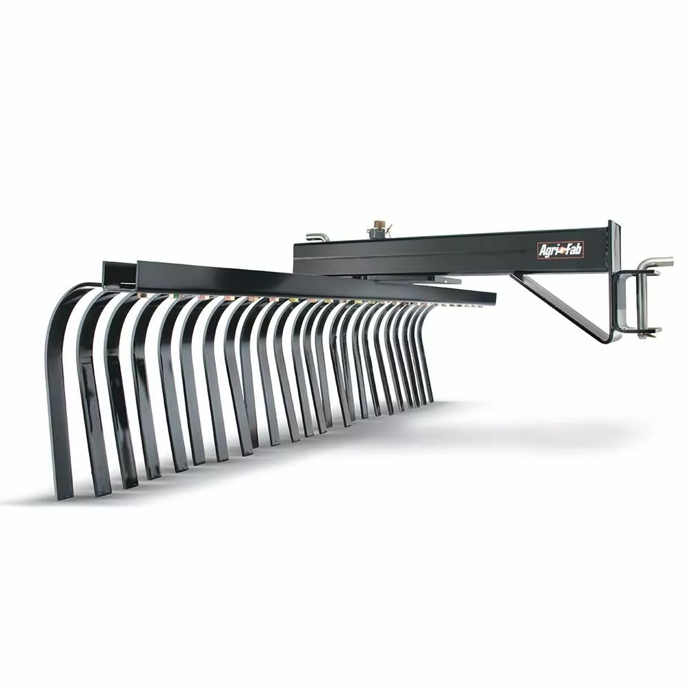 Agri-Fab Sleeve Hitch Rock Rake is ideal for backfilling, removing debris from gardens and lawns, or finishing ball diamonds. The Agri Fab 48 in. landscape rake is a heavy-duty, no-hassle powerhouse. A large, 48 in. working width covers more ground in less time. The rake adjusts up to 24° angles left or right for exceptional raking versatility. An elongated handle raises and lowers the attachment quickly and simply. Featuring strong, 1/4 in. heat-treated steel tangs, the landscape rake 48 in. can take great wear and tear, without losing shape. The tangs are spaced for thorough coverage. Weighing only 72 lbs. with overall dimensions of 50.5 x 12.5 x 7.5 the rake stores easily, and it is extremely portable and maneuverable.