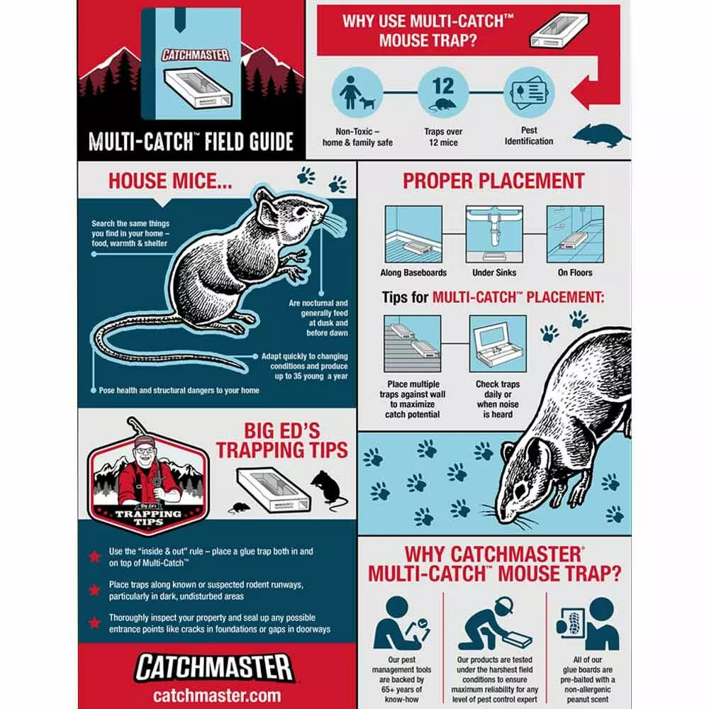 The Catchmaster® Multi-Catch™ Mouse Trap will effectively eliminate mice. Designed for maximum reliability and ease-of-use. Traps 10-12 mice per setting and can be used with or without the glue board. Trap is a Live Catch if used without the glue board. When deployed under normal conditions our long-lasting traps are effective for up to one full year. Our adhesive formula has been specially designed to prevent hardening that can limit effectiveness. In case of contact with adhesive, use vegetable or mineral oil to remove from skin or animals.