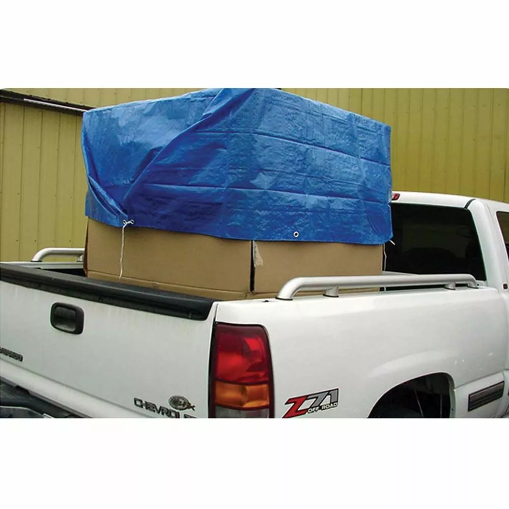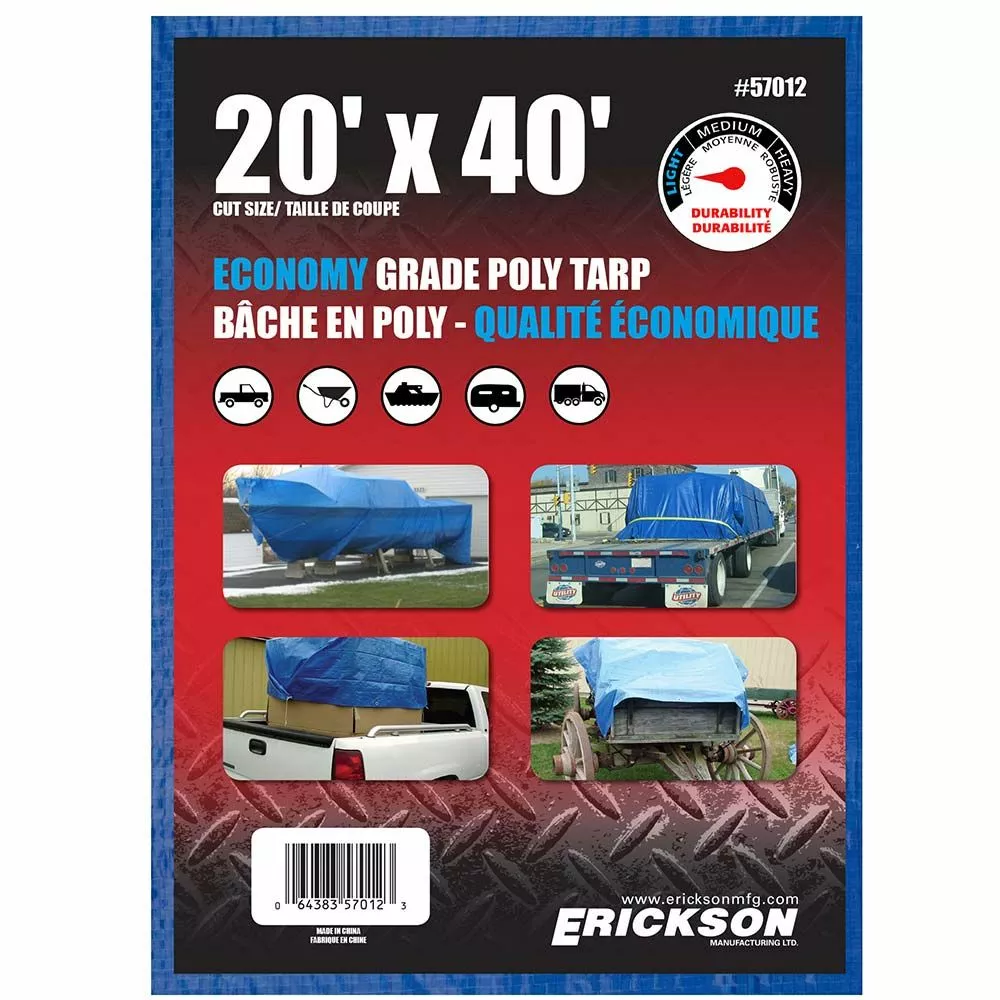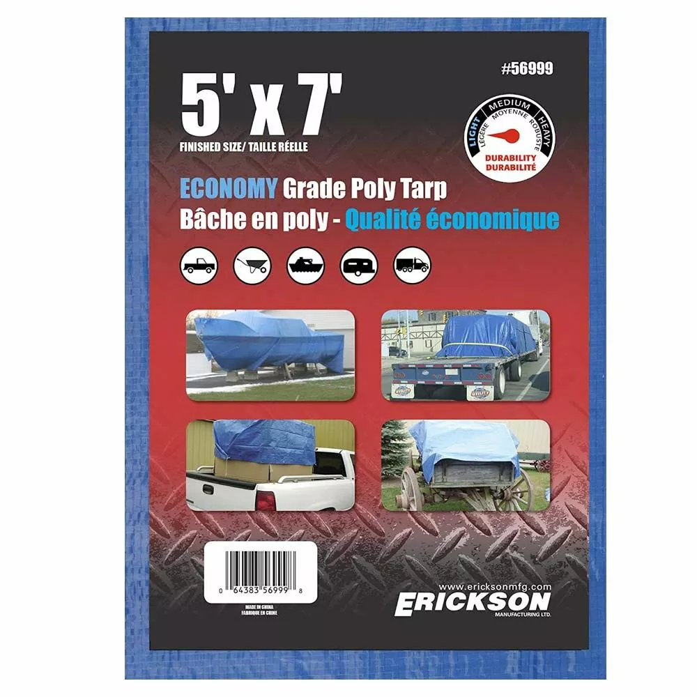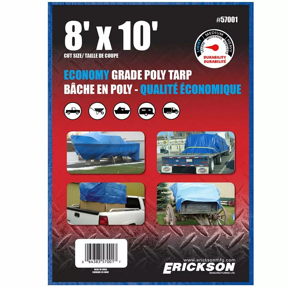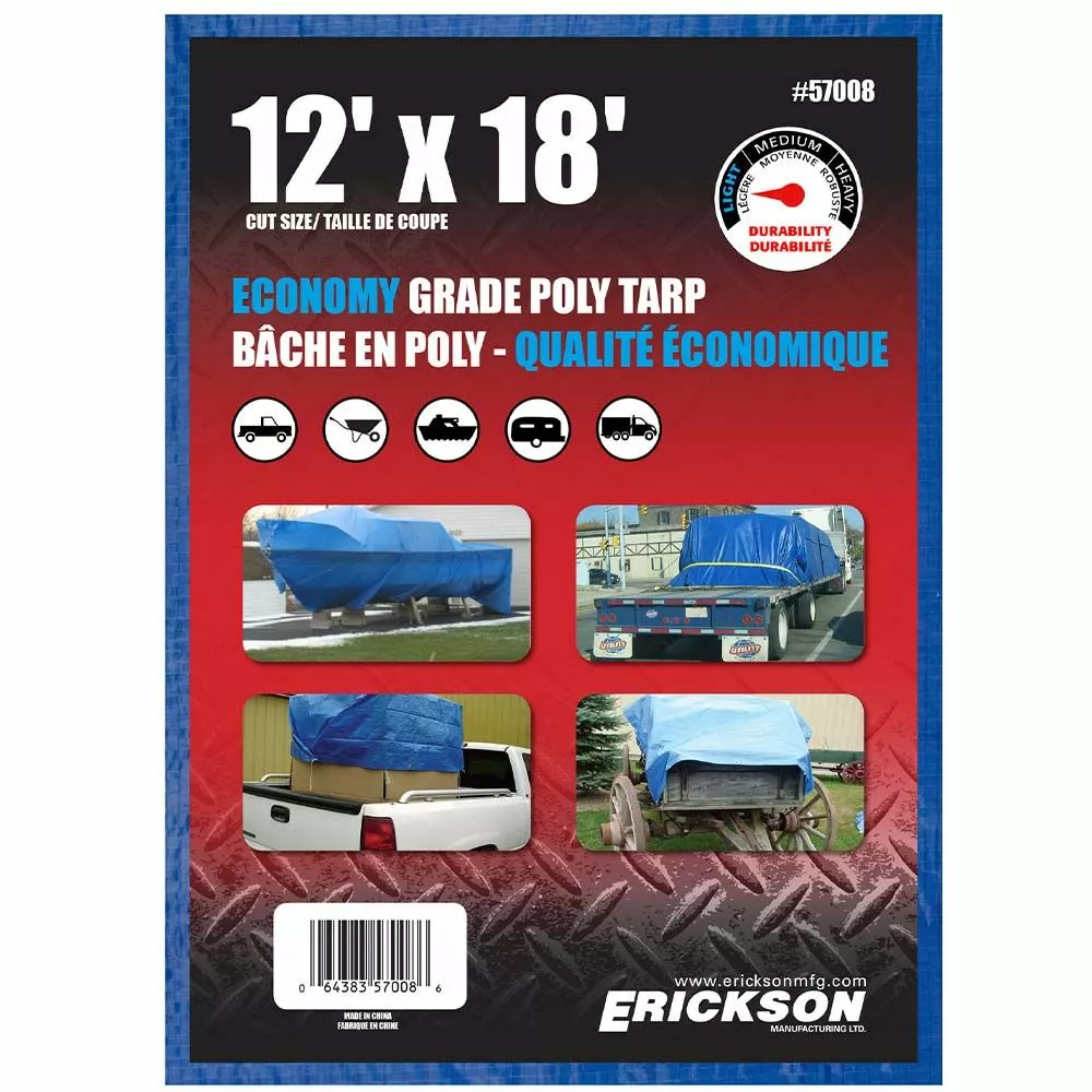 Erickson All Purpose Blue Economy Grade Tarp is designed to be a short-term or one-time use tarp. This light duty tarp is ideal to cover the load in the back of your pick-up truck, for picnics and camping, boating and many more uses! This tarp has increased UV content for longer life, rust resistant grommets and is lightweight and flexible for easy storage. There are aluminum grommets every 3 feet and at reinforced corners. Size are cut size dimensions.