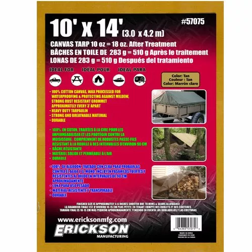 Erickson Canvas Tarps are wax processed for waterproofing and protecting against mildew. There are strong rust resistant grommets approximately every 3 feet. These durable canvas tarps are made with a strong and breathable material.