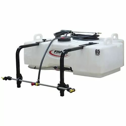 Fimco 65 Gallon 3-Nozzle Boomless UTV Sprayer has built in drip free shutoff valves that spray from 6 to 30 feet. The low profile 65 gallon tank provides improved stability and center of gravity. The molded handles are for easy installation in UTV's. The pump/manifold is conveniently positioned near the UTV cab to easily set sprayer PSI. The spray boom has a quick release for fast assembly and disassembly. It can be used with the UTV tailgate closed or open. The deluxe handgun sprays 35 feet horizontally and 26 feet vertically.