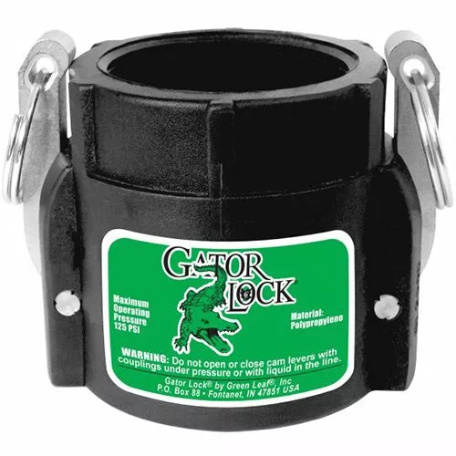 Gator Lock Female Coupler Female Thread are polypropylene couplings with EPDM gaskets. The exclusive Cam Lever Locking Mechanism helps to reduce the possibility of unintentionally opening the cam levers, which could result in personal injury and costly spills. These cam-level couplings have a smooth sealing surface.