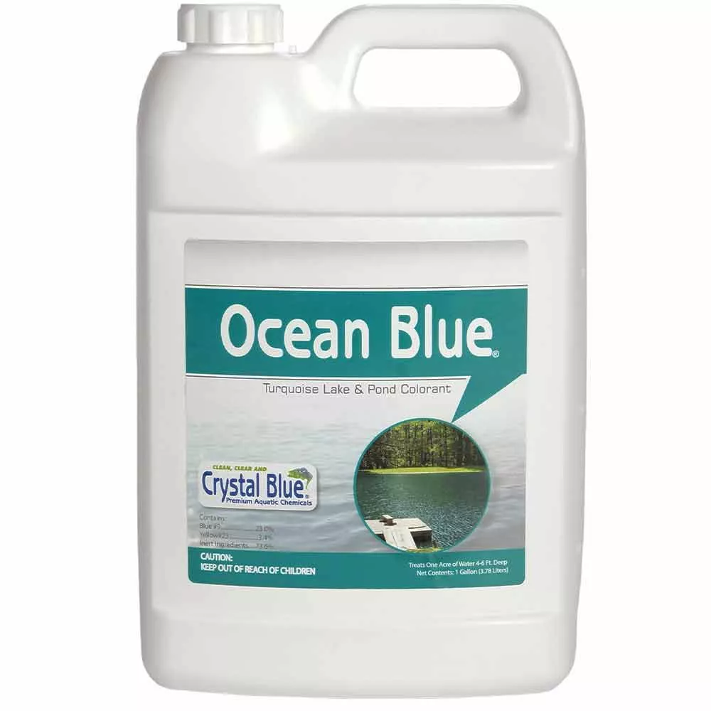 Crystal Blue® Ocean Blue Lake and Pond Colorant enhances the color of your lake or pond all year long. 100% Safe, No irrigation or consumption restrictions. Beautiful turquoise blue color.