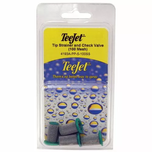 TeeJet® Steel Tip Strainer with Check – 4 Pk. minimizes nozzle dripping. The ball check opens at 5 PSI. They are recomended for flow rates up to 0.8 gpm (3 l/min.). Note: Use of these ball check valves results in a pressure drop of 5 PSI (0.34 bar) to 10 PSI (0.7 bar) depending on spring rating. Not for use with AI or DG tips.